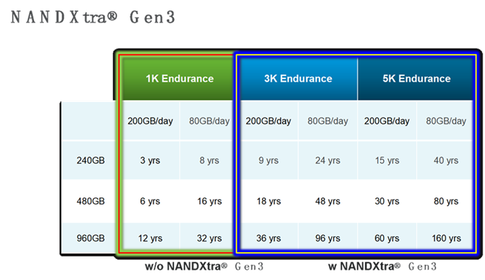 長期的測(cè)試結(jié)果顯示,在NANDXtra® Gen3可靠性引擎的加持下,閃存顆粒平均使用壽命整體提升3到5倍,為采用QLC顆粒的SSD企業(yè)以及搭載使用QLC顆粒SSD的整機(jī)企業(yè)免去后顧之憂。